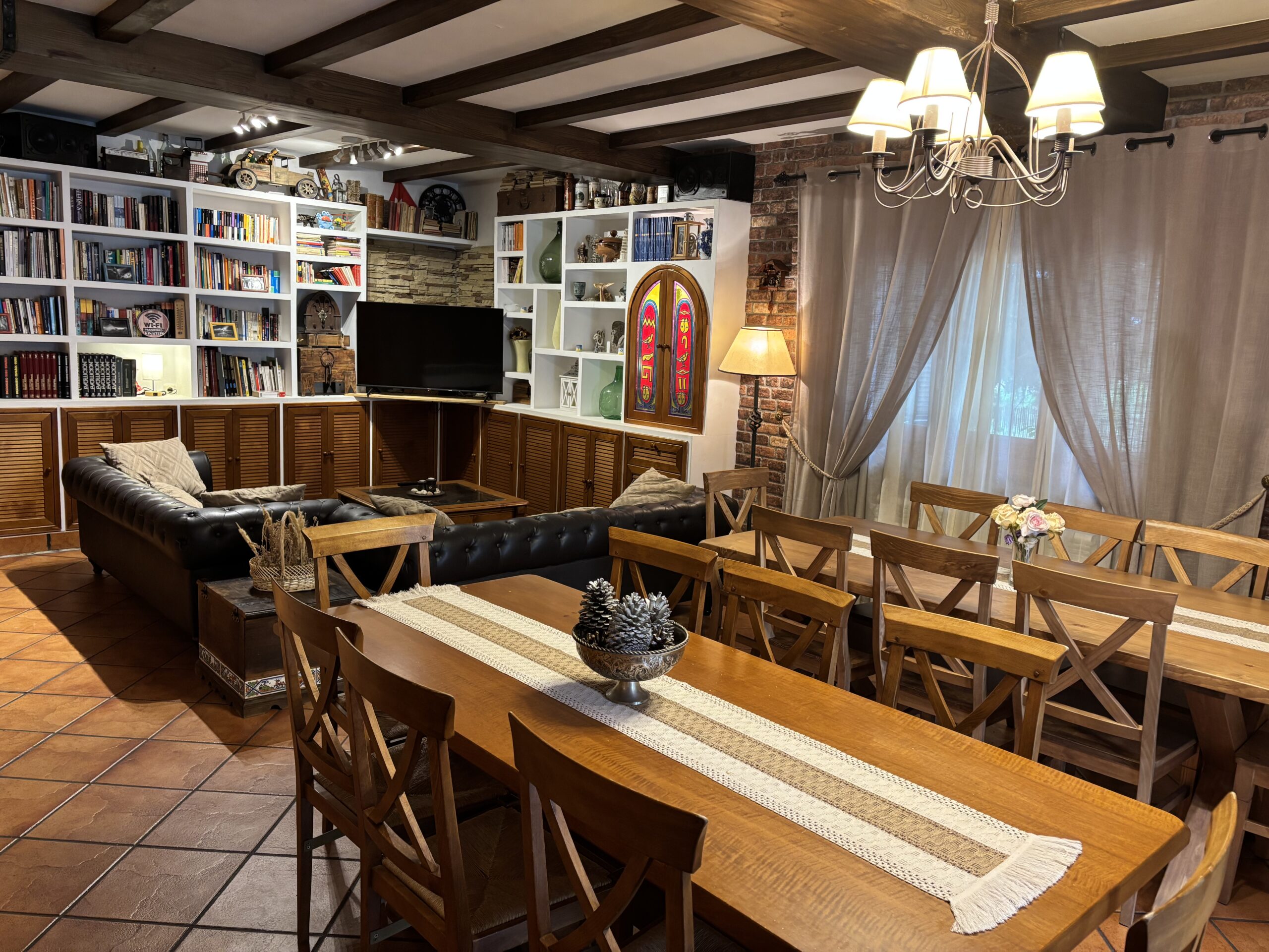 Smart TV de 50 pulgadas y sonido Dolby Surround que hace que parezca que estás en el cine. Mesas de madera maciza y sus sillas para hasta 18 comensales.